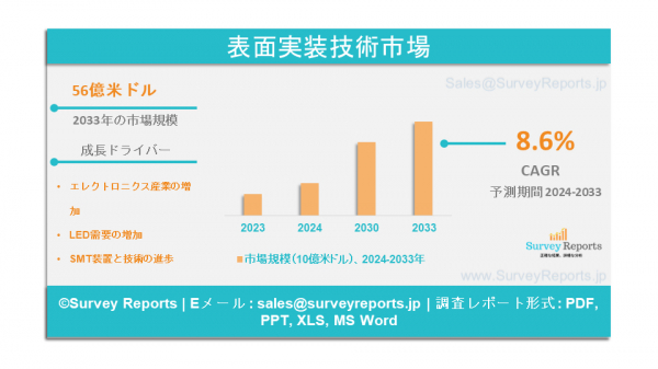 サーベイレポート合同会社は、表面実装技術市場の予測評価を提供する2024年8月発行の調査レポート「表面実装技術市場:部品別(アクティブ、パッシブ、電気化学)、装置別(検査、配置、はんだ付け、スクリーン印刷、クリーニング、修理・リワーク)、最終用途別(家電、自動車、医薬品・医療機器、通信、航空宇宙・防衛、産業、その他)-世界市場分析、動向、機会、予測、2024-2033年」を発表しました。表面実装技術市場の成長促進要因、市場機会、課題、脅威など、いくつかの主要な市場ダイナミクスを紹介しています。