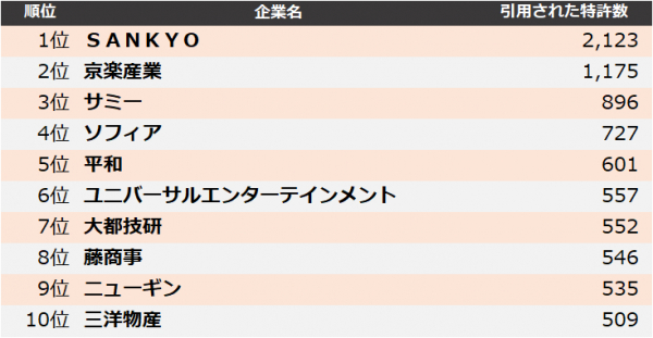 遊技機業界の被引用件数上位30社のランキング