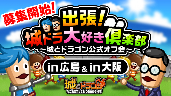 「城ドラ大好き倶楽部」でお馴染み、さねしげと西くぼアナが全国6ヶ所を巡る公式オフラインイベント『出張!城ドラ大好き倶楽部~城とドラゴン公式オフ会~』の第4弾を10月12日(土)に広島県・広島駅付近の会場にて、また第5弾を10月13日(日)に大阪府・大阪駅付近の会場にて開催いたします。開催に先駆け、8月6日(火)より各イベントの参加メンバーを募集中!奮ってご応募ください!