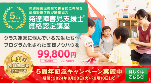 8月20日(火)~9月10日(火)のキャンペーン期間中、「発達障害児支援士」もしくは「発達障害児支援士+発達障害児専門支援士(セット受講)」をお申込みいただくと、受講期間が「6ヶ月延長」になります。