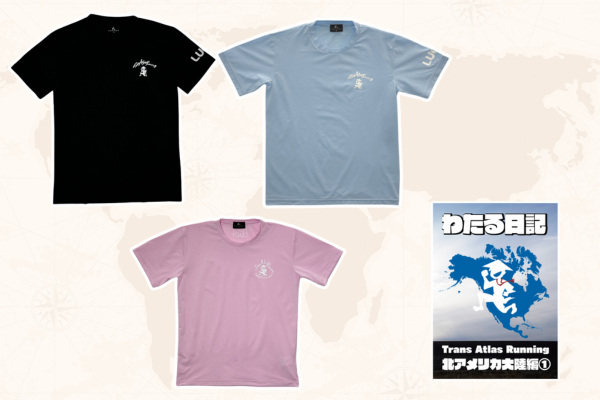 北アメリカ大陸14,000km走破を記念したオリジナルTシャツは、いいの選手がこれまでに走った北アメリカ大陸のルートやTARロゴをプリント。1枚わずか95g(Mサイズ)。ストレッチ性に優れた生地を使用し、速乾性にも優れています。カラーはブラック、ライトブルーの2色。