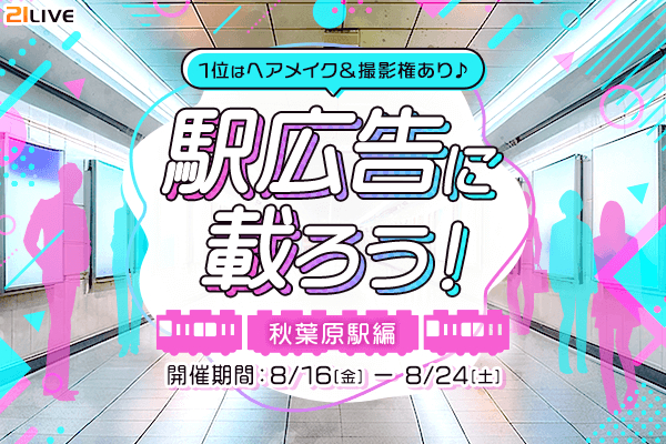 株式会社エムアンドティーティー(本社:沖縄県北谷町、代表取締役:井藤 三知子)が運営するエンターテイメント・ライブ配信アプリ【21LIVE(ニーイチライブ)】URL: https://21.live では、8月16日(金)より『駅広告に載ろう~秋葉原駅編~』を開催。1位入賞者にはヘアメイク&撮影権とB2サイズのポスターをプレゼントいたします。