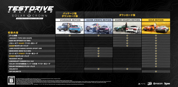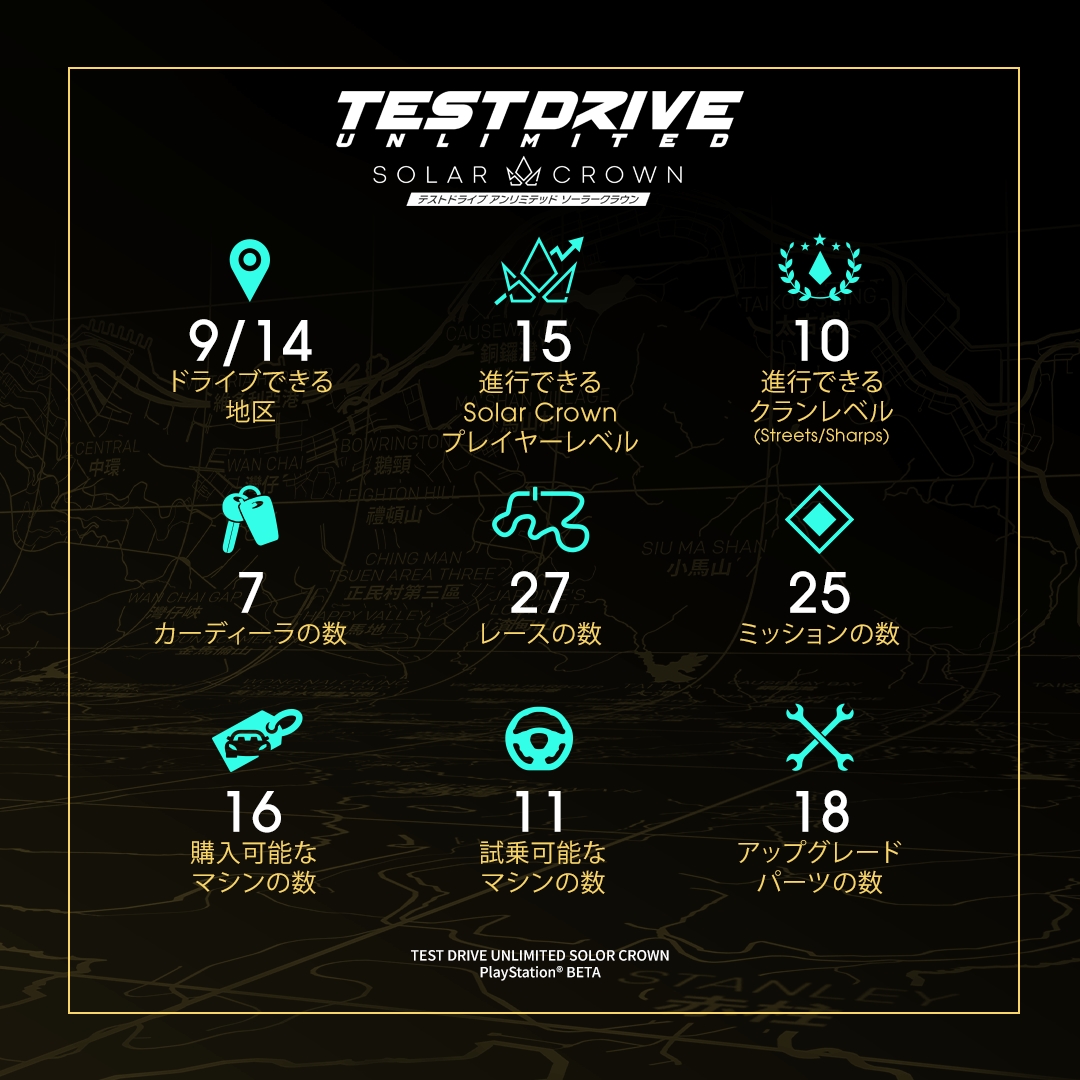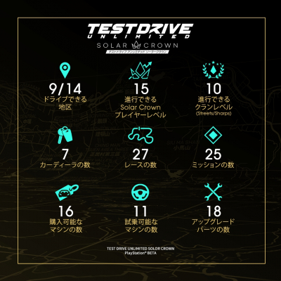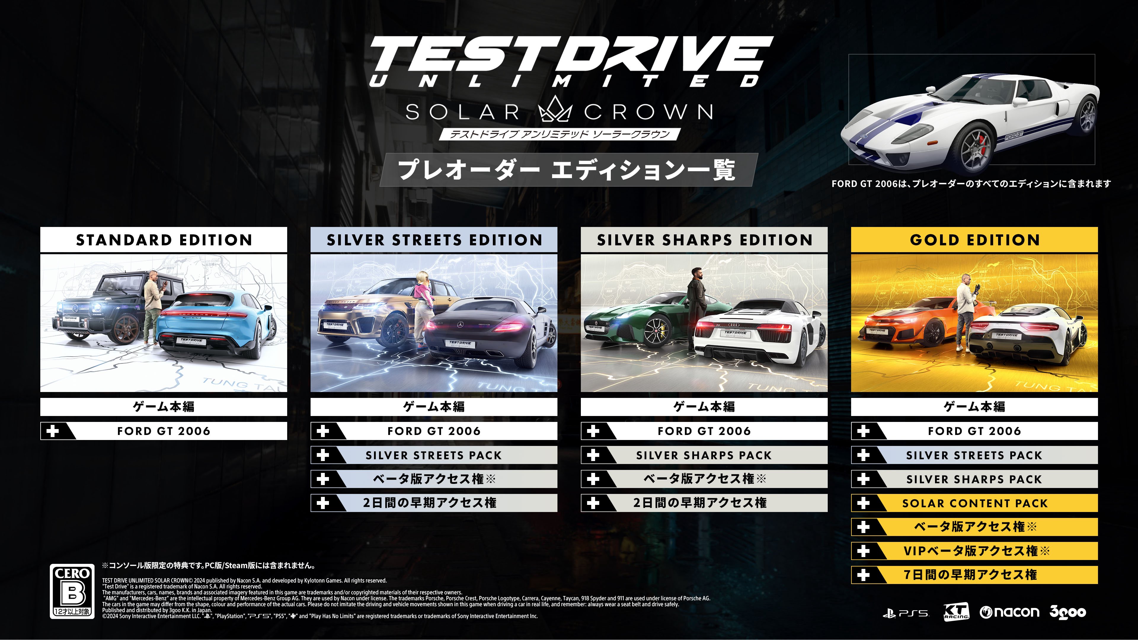 ーシングゲーム『テストドライブ アンリミテッド ソーラークラウン』の PlayStation(R)5(パッケージ版およびダウンロード版)版を 2024 年9月12 日(木)に発売します。この度、「Gold Edition」(ダウンロード版のみ)プレオーダー購入者向け特典となるVIPベータ版の詳細を発表いたしました。