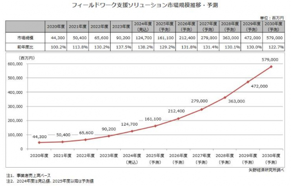 フィールドワーク支援ソリューションは、中・長期的にも現場での人手不足や現場作業者の高齢化への対策、さらには働き方改革やワークスタイル変革の実現に資するソリューションとしての普及・拡大が確実視される。2024年度以降、毎年30%前後の伸長が続く見込みで、2030年度のフィールドワーク支援ソリューション市場規模は5,790億円に達すると予測する。