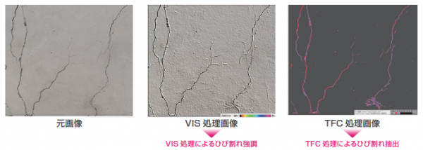 「VIS&TFC」は、錯視を誘発する画像処理によりひび割れを強調表示するシステム「VIS※1」と、画像の特徴を分類・解釈する「TFCアルゴリズム※2」の機能を組み合わせたシステムで、東京理科大学小島研究室(創域理工学部 社会基盤工学科)の特許を利用しています。