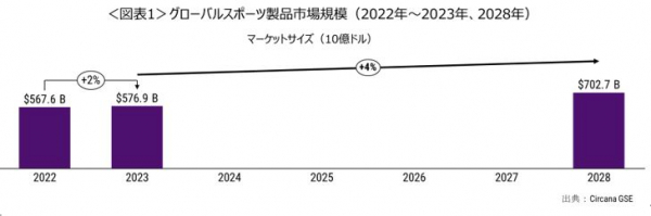 2023年のグローバルにおけるスポーツ製品市場は87兆円(=5769億ドル)となり、前年比2%増でした(図表1)。また将来に目を向けると、GSEはグローバルにおけるスポーツ製品市場が2028年には105兆円(=7027億ドル)にまで成長すると予測しています。これは年率に換算すると平均4%増に相当し、今後5年間にわたり市場の成長が期待できることを示しています。