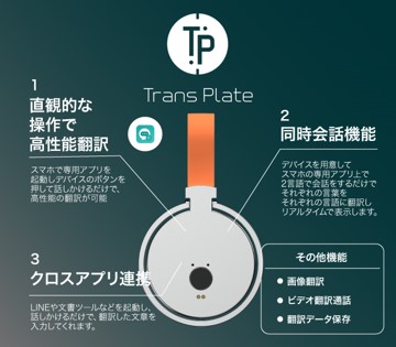 「Trans Plate」は、スマートフォンと連携して使用する、OpenAI社製の高性能翻訳エンジンを搭載した、スマートな翻訳機です。専用アプリを介し、デバイスのボタンを押して言葉を発するだけで行える高性能翻訳を始め、「同時会話機能」や「クロスアプリ連携」など、翻訳をさらに便利にする機能が多数搭載されています。 翻訳エンジンは、合計138カ国の言語に対応しており、また学習機能を搭載しているため、翻訳の精度は日々進化し続けます。