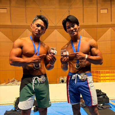 メンズフィジーク168cm以下級で優勝した石塚光選手(右)、準優勝の鈴木喬良選手。