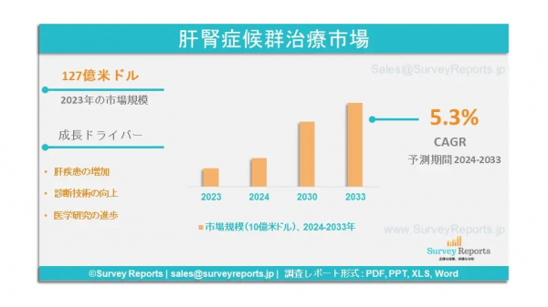 サーベイレポート合同会社は、肝腎症候群治療市場の予測評価を提供する、タイプ別(1型肝腎症候群、2型肝腎症候群)、治療法別(治療薬、外科的治療、その他)、エンドユーザー別(病院・クリニック、外来、手術センター、学術・研究機関、その他)-世界市場分析、動向、機会、予測、2024-2033年の調査レポート「肝腎症候群治療市場:タイプ別(1型肝腎症候群、2型肝腎症候群)、治療法別(治療薬、外科的治療、その他)、エンドユーザー別(病院・クリニック、外来、手術センター、学術・研究機関、その他)-世界市場分析、動向、機会、予測、2024-2033年」を2024年8月に出版しました。肝腎症候群治療市場の成長促進要因、市場機会、課題、脅威など、いくつかの主要な市場ダイナミクスをハイライトしています。