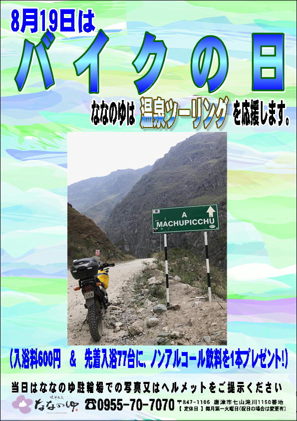 株式会社鳴神温泉(佐賀県唐津市 代表取締役 鬼塚 晃)が佐賀県唐津市七山地区で運営する日帰り温浴施設「ななのゆ」は、8月19日の「バイクの日」に、オートバイで来館されたお客様へ「バイクの日」限定サービスを実施します。