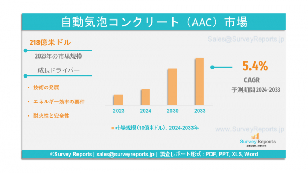サーベイレポート合同会社は、オートクレーブドエアレーテッドコンクリート(AAC)市場の予測評価を提供する2024年8月発行の調査レポート「オートクレーブドエアレーテッドコンクリート(AAC)市場の製品タイプ別セグメント(ブロック、梁・まぐさ、被覆パネル、壁パネル、屋根パネル、床要素、その他);用途別セグメント(住宅、商業、工業)-世界市場分析、動向、機会、予測、2024-2033年」を発表しました。この調査レポートは、AAC(Autoclaved Aerated Concrete)市場の予測評価を掲載し、AAC(Autoclaved Aerated Concrete)市場の成長促進要因、市場機会、課題、脅威など、いくつかの主要な市場ダイナミクスを明らかにしています。