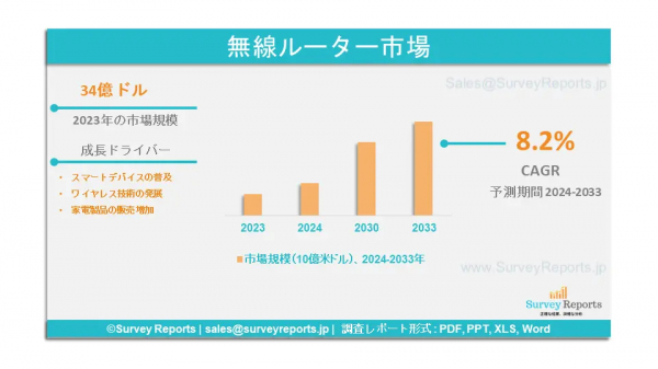 サーベイレポート合同会社は、ワイヤレスルーター市場の予測評価を提供する調査レポート「ワイヤレスルーター市場:コンポーネント別(シングルバンド無線ルーター、デュアルバンド無線ルーター、トライバンド無線ルーター);エンドユーザー別(BFSI、政府、IT&テレコム、小売、ヘルスケア、その他)-世界市場分析、動向、機会、予測、2024-2033年」を2024年8月に発行したと発表しました。無線ルータ市場の成長促進要因、市場機会、課題、脅威など、いくつかの主要な市場ダイナミクスを紹介しています。