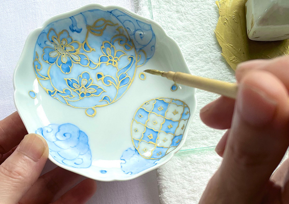繊細優美な長崎の伝統工芸「三川内焼」。本体験会では、あらかじめ真っ白な白磁に青い丸紋の上絵を施した豆皿に、本金を使い、お好きな箇所に自由に線を描いていただきます。