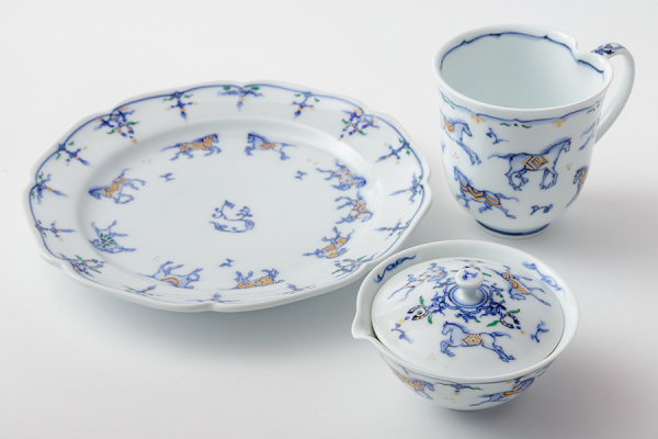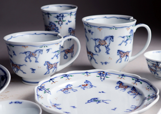 特に、馬は代々藤本家の得意とした題材で、江戸期の三川内焼(古平戸)として所蔵されている馬の絵の骨董品の中には、藤本家で造られたものが多く伝わっています。 その伝統模様の中でも、『馬九行久(うまくいく)』という絵柄は、馬が九頭で「うまくいく」という縁起良い語呂合わせの絵柄で、平戸藤祥五光窯では染付に色絵や金彩を加えて描いています。