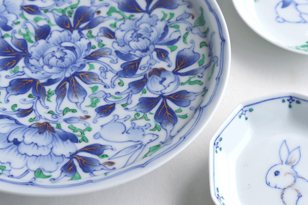 平戸藤祥五光窯で絵付けを担当している伝統工芸士・藤本江里子は、「金襴二度焼」の色合いに青や緑のカラーバリエーションを加えて描いています。伝統の唐草模様に加え、正倉院御物や干支の縁起模様などからモチーフを得て、花鳥絵や龍や馬の絵柄を描いています。
