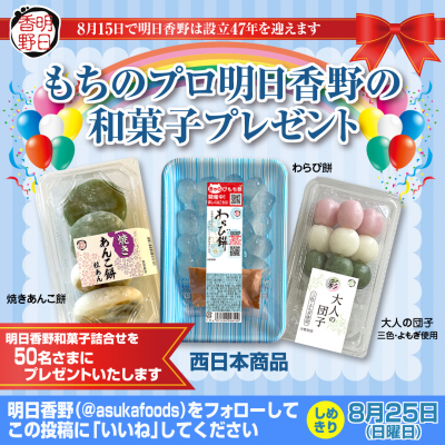 この度、明日香野は8月15日に設立47年を迎えました。これからも明日香野はお近くのスーパーマーケット様を通じて、皆さまに毎日「ちょっと食べる」喜びをお届けさせていただきます。そんな明日香野から、8月13日に開始した「もちのプロ明日香野の和菓子プレゼント」キャンペーンのご案内です。