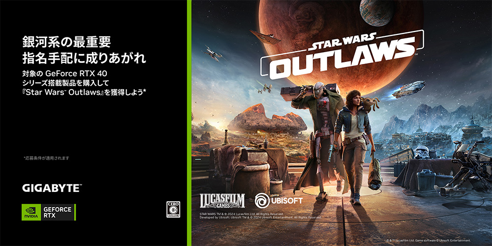 2024年8月21日 - GIGABYTE Technology Co., Ltd. 台湾・新北市 - コンピュータテクノロジーで世界をリードするGIGABYTE Technologyは、2024年8月20日~9月19日の期間中、対象のNVIDIA GeForce RTX 40シリーズ搭載製品をご購入いただいたユーザーに、Ubisoftの新作オープンワールド・アクションアドベンチャーゲーム「Star Wars Outlaws(スター・ウォーズ 無法者たち)」PC版(2024年8月30日発売予定)のゲームクーポンコードをもれなくプレゼントするゲームバンドルキャンペーンを実施いたします。