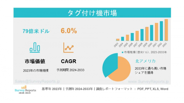 サーベイレポート合同会社は、タグ付け機市場の予測評価を提供する製品タイプ別(手動タグ付け機、自動タグ付け機、半自動タグ付け機);用途別(製薬市場、食品市場、化学市場、その他)-タグ付け機市場の世界市場分析、動向、機会、予測、2024-2033年8月調査レポート「タグ付け機市場の製品タイプ別(手動タグ付け機、自動タグ付け機、半自動タグ付け機);用途別(製薬市場、食品市場、化学市場、その他)-タグ付け機市場の世界市場分析、動向、機会、予測、2024-2033年8月調査」を出版しました。タギングマシン市場の成長促進要因、市場機会、課題、脅威など、いくつかの主要な市場ダイナミクスを紹介しています。