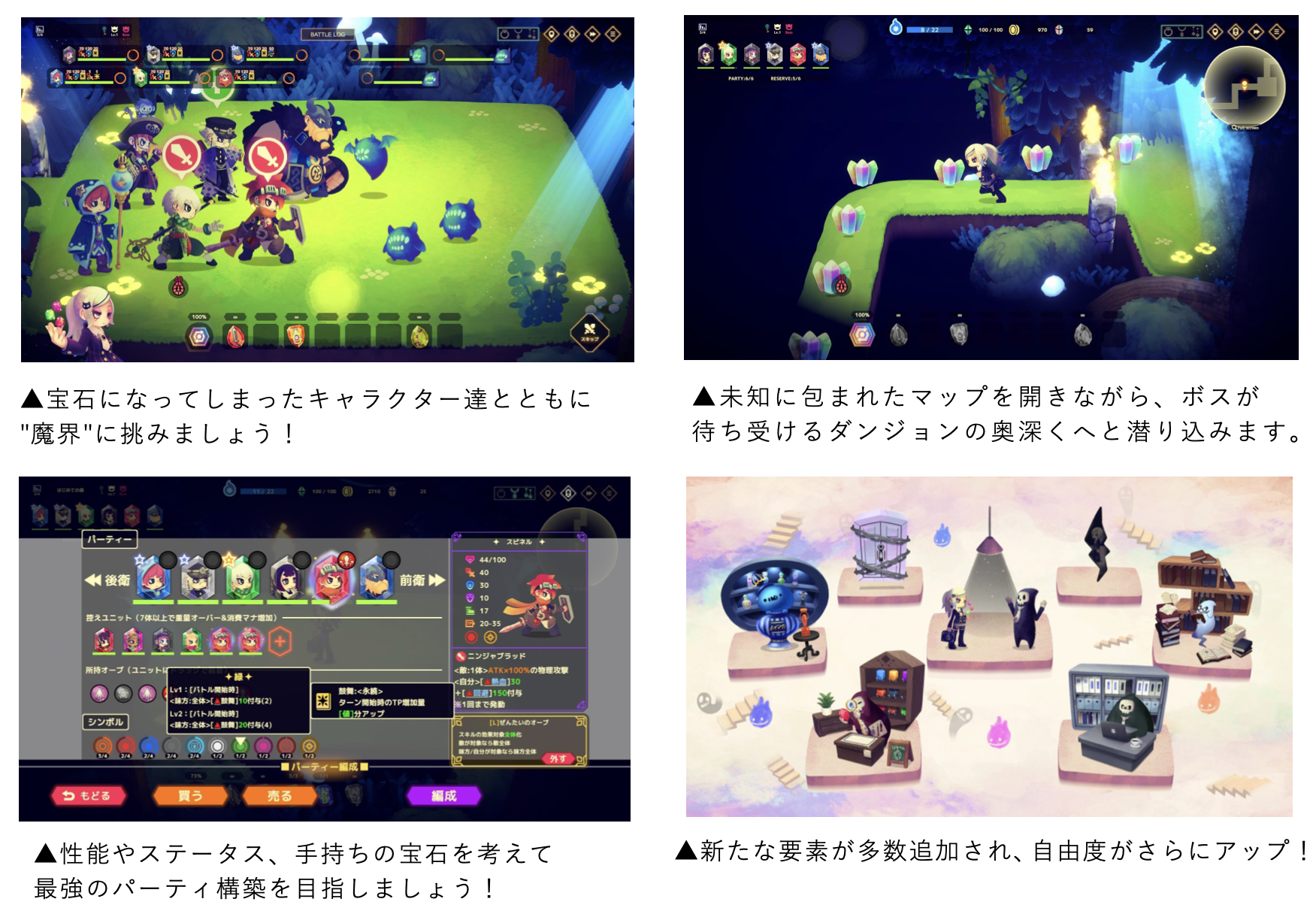 『ビビッドワールド』は、さまざまな能力を持つキャラクター達でパーティを構築し、謎に包まれた"魔界"の踏破を目指すパーティ構築型ローグライクゲームです。宝石となってしまったキャラクターを集めて組み合わせることで、パーティの強さが爆発的にパワーアップ。プレイヤーのジェムで戦闘をサポートしつつ、自分だけの最強パーティで"魔界"に隠された謎とダンジョン踏破に挑みましょう。