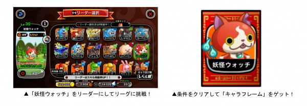 コラボ限定キャラ「妖怪ウォッチ」をリーダーにしてリーグに挑む「リーダー腕利きGP」を開催いたします。バトルに勝利してより多くの「キャラフレP」を獲得したランキング上位者や条件を達成した方には、コラボ限定「キャラフレーム」が贈られます。