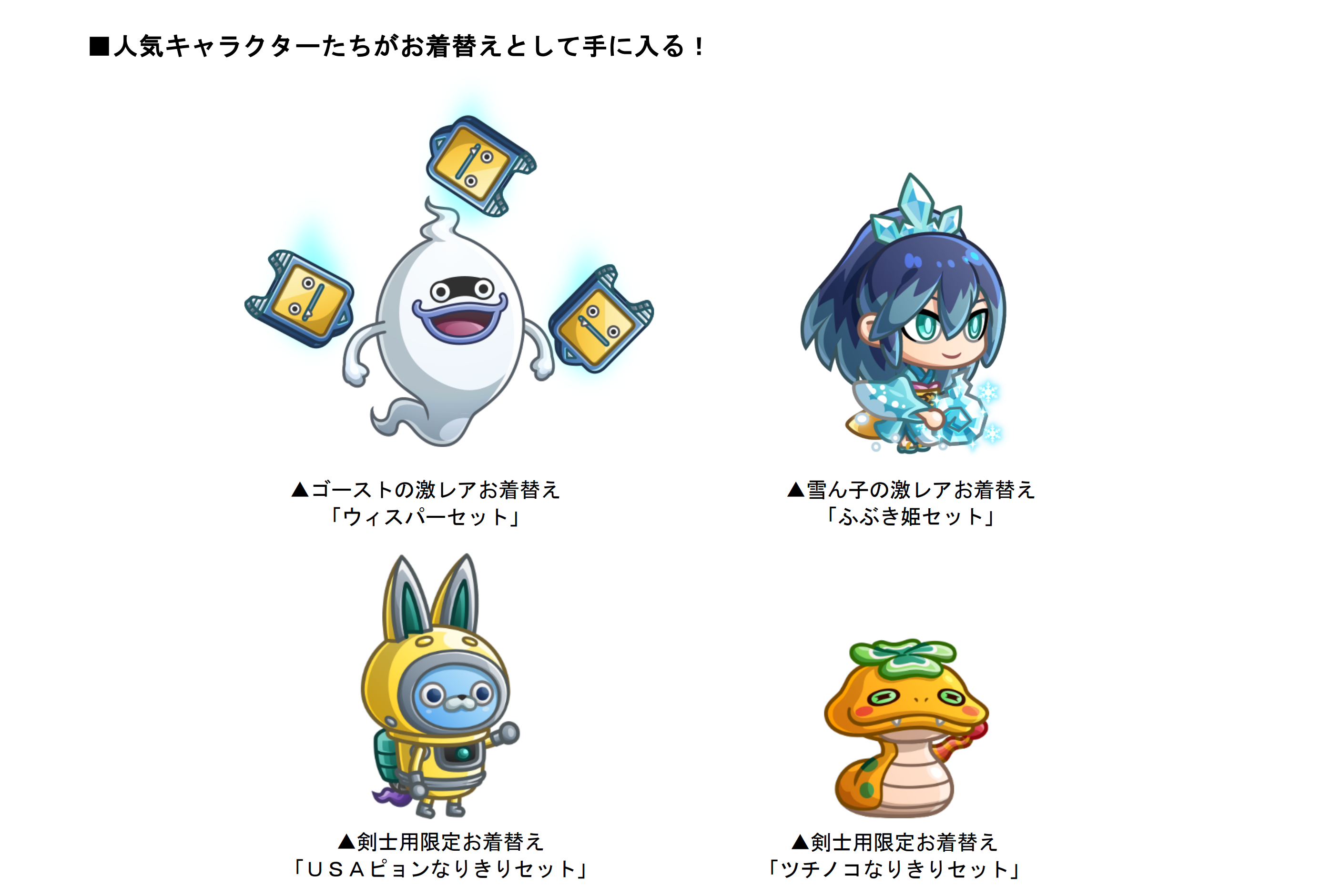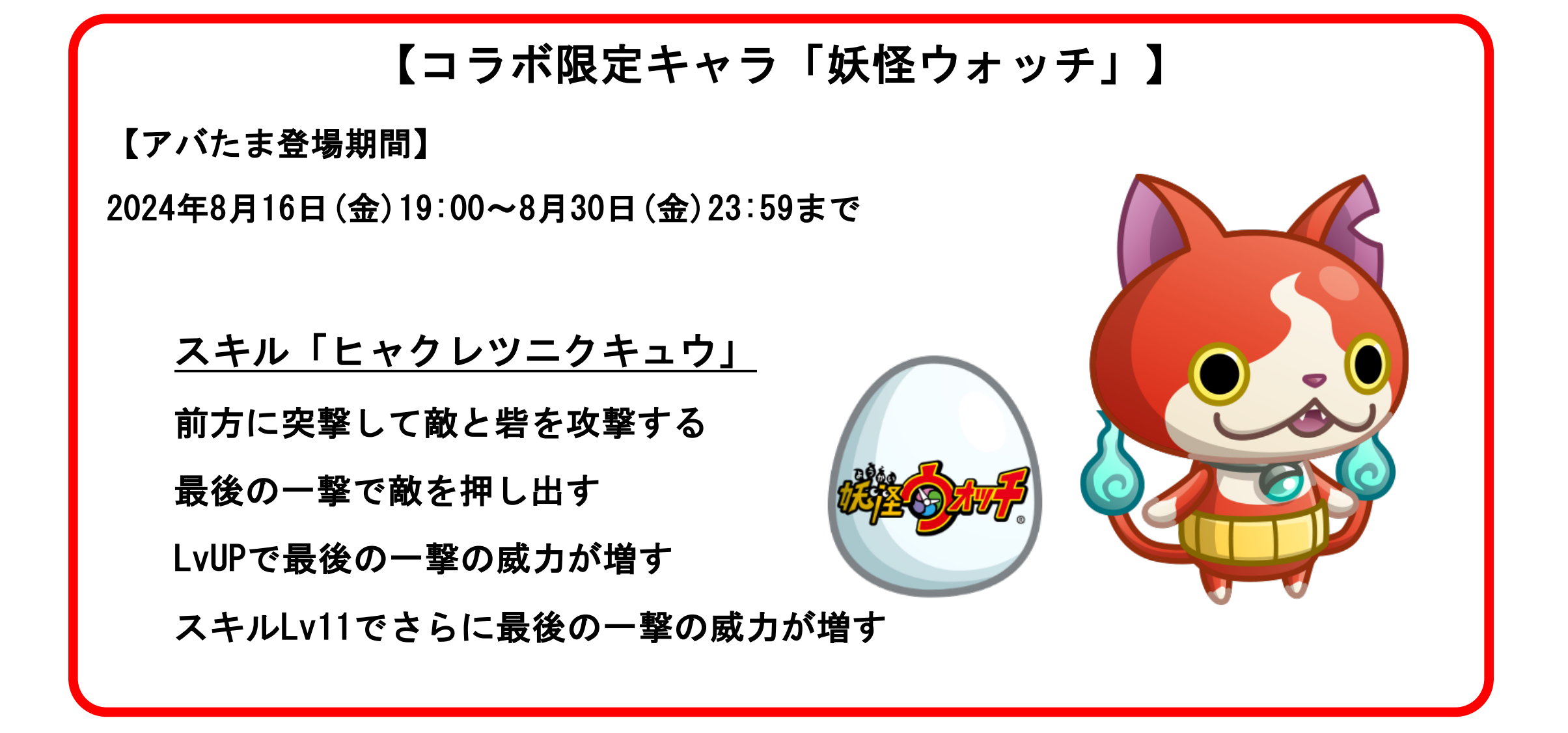 「コラボのアバたま」に限定キャラ「妖怪ウォッチ」が登場!「妖怪ウォッチ」は初回当選でキャラタマゴとして「ジバニャン」が入手できます。以降、当選回数に応じて「ロボニャン」「コマじろう」「フユニャン」「ブシニャン」「コマさん」の順でお着替えが手に入ります。また、ゴーストの激レアお着替え「ウィスパーセット」、雪ん子の激レアお着替え「ふぶき姫セット」、剣士用コラボ限定お着替え「USAピョンなりきりセット」「ツチノコなりきりセット」も登場しますので、アバたまを割って、コラボ期間中にしか手に入らない限定キャラタマゴやアイテムを手に入れましょう!