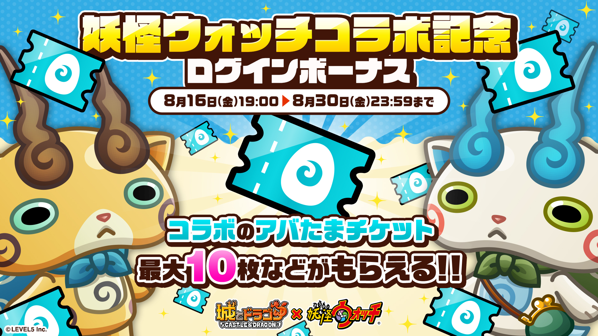 8月16日(金)より、『妖怪ウォッチ』との初のコラボイベントを開催いたします。期間中は、「妖怪ウォッチ」がコラボ限定キャラとして「コラボのアバたま」に登場。さらに城ドラキャラのお着替え「ウィスパー」「ふぶき姫」「USAピョン」「ツチノコ」セットも「コラボのアバたま」に登場します。また、イベントで条件をクリアすると、「キュウビ」のお着替えが入手できます。報酬がもらえるイベントも盛りだくさんな期間限定のコラボをぜひお楽しみください。