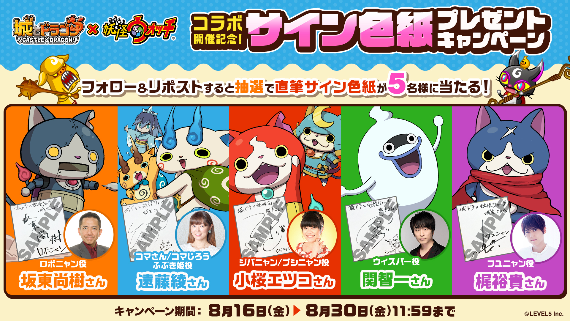 8月16日(金)より、「コラボ開催記念!サイン色紙プレゼントキャンペーン」を実施いたします。『城とドラゴン』公式X(旧Twitter)アカウントをフォローし、対象ポストをリポストしていただいた方の中から抽選で、小桜エツコさん、遠藤綾さん、坂東尚樹さん、梶裕貴さん、関智一さんの直筆サイン色紙をそれぞれ1名様にプレゼントいたします。