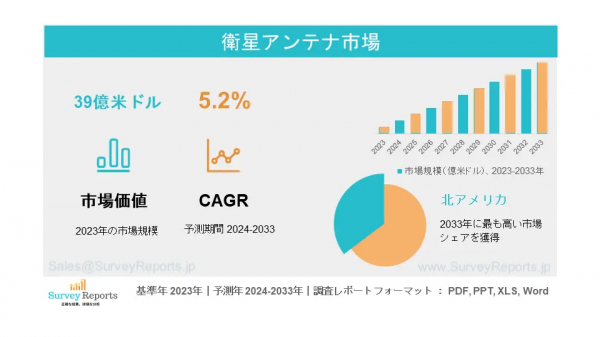 サーベイレポート合同会社は、衛星アンテナ市場の予測評価を提供する技術タイプ別(パラボラアンテナ、フラットパネルアンテナ、ヘリカルアンテナ、その他);用途別(通信衛星、地球観測衛星、航法衛星、科学衛星、その他)-世界市場分析、動向、機会、予測、2024-2033年の調査レポート「衛星アンテナ市場:技術タイプ別(パラボラアンテナ、フラットパネルアンテナ、ヘリカルアンテナ、その他)-世界市場分析、動向、機会、予測、2024-2033年」を2024年8月に発行しました。衛星アンテナ市場の成長促進要因、市場機会、課題、脅威など、いくつかの主要な市場ダイナミクスを紹介しています。
