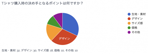 Tシャツ購入時の決め手となるポイントについて、「生地・素材」が32%と、Tシャツという直接肌に触れる衣類の特性上、生地・素材を重視する人が最も多い結果となりました。