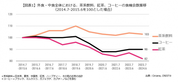 茶系飲料の食機会数、9年で3%増、紅茶は18%減