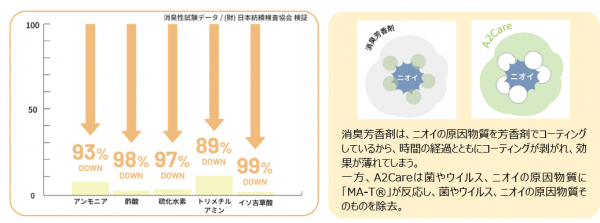 確かな除菌力・消臭力を持ちながらも高い安全性が実現できる理由は、「MA-T(R)」を採用しているから。「MA-T(R)」は大阪大学の研究でも高い効果が認められた除菌消臭システムで、反応すべき菌やウイルス、ニオイの原因物質が存在する時にのみ、有効成分の水性ラジカルが必要な量だけ生成され反応します。この狙い撃ちの技術がA2Careの最大の特長であり、高い安全性と確かな除菌消臭力を両立できる秘密です。