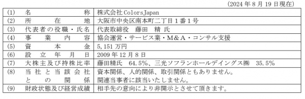 ColorsJapan社との業務提携につきましては、2024年6月17日付「ColorsJapan社との業務提携によるM&A強化に関するお知らせ」のとおり、マーチャント社が、ColorsJapan社と業務提携し、M&Aに取り組み、さらなる企業価値向上をはかるものであります。