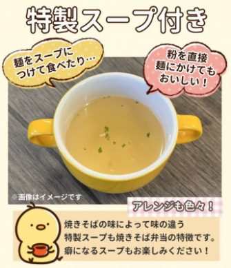 チキンと野菜の旨みにほのかなバターの風味を利かせたたらこ味のやきそば弁当。コンソメスープ付。