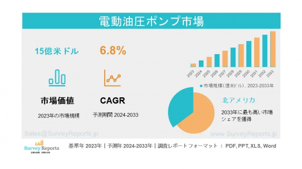 サーベイレポート合同会社は、電動油圧ポンプ市場の予測評価を提供する調査レポート「電動油圧ポンプ市場:タイプ別(巻線界磁モータ、永久磁石モータ、可変容量);用途別(バスとコーチ、商用車、建設、農業機械)-世界市場分析、動向、機会、予測、2024-2033年」を2024年8月に発行したと発表しました。電動油圧ポンプ市場の成長促進要因、市場機会、課題、脅威など、いくつかの主要な市場ダイナミクスを紹介しています。