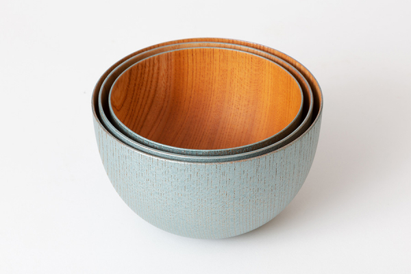 このうつわは、挽物ろくろの技術を生かし、欅(けやき)を厚み1.5mmと極限まで薄くくり抜く「薄挽き」により、正確に形サイズを合わせてつくる入れ子の技術を生かし、驚くほど軽くシンプルなうつわです。また、薄いながらも、天然木は熱を伝えにくいため、手に持っても熱くなく、入れ子に収納でき、機能面も兼ね備えています。