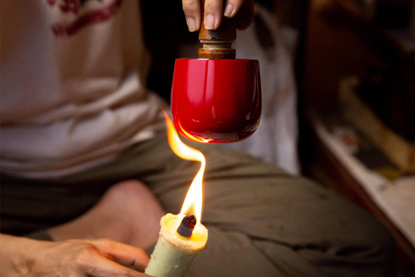 側面の黒く見える模様は、和ろうそくの煤を利用した叢雲塗(むらくもぬり)と言われる変わり塗の技法です。漆が固まる前に和ろうそくの煤を付け、黒い雲や炎のゆらぎと思わせる模様に仕上げています。