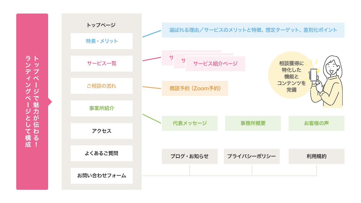 もっとも多くのアクセスが見込まれるトップページを、顧客獲得に最適化したランディングページとして構成します。これにより、得意分野や実績、メッセージなどをアピールし、初回相談の意欲を喚起し、スムーズに相談予約へとつなげることが可能です。
