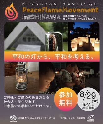 コマニーでは、この「平和の火」を八女市から分けていただき、8月29日(木)18時30分から「ピースフレイムムーブメント in ISHIKAWA」と題し、平和について考えるイベントを開催いたします。このイベントでは、「平和の火」の前で平和について考え、願いを共有し、そして未来の子どもたちや世界に夢や希望をもてる社会について話し合います。