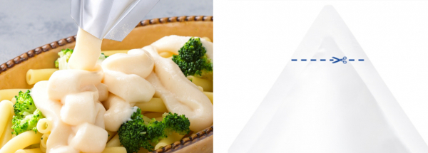 そして、絞り出したとき具材の上でソースが流れ落ちてしまわない使い勝手のよい粘度にこだわっています。さらにパッケージは、小さな容器へ絞り出しやすい三角形の絞り出し口にして、少量ずつの使用にも適しています。