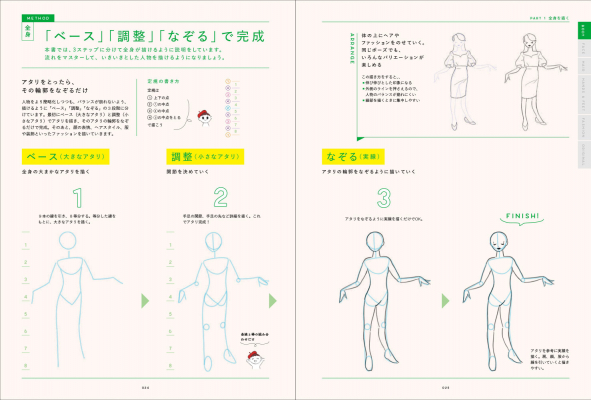 3ステップで全身の描き方を説明。円と線で描く大きなアタリ、調整する小さなアタリ、それをなぞって完成させる、誰でもできる描き方を紹介。解説した内容を実践できる描き込みページも用意してあり、すぐに練習ができます。