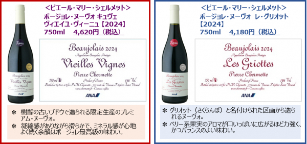 ANA国際線ファーストクラス(全路線)において、ANAオリジナルラベルの「ピエール・マリー・シェルメット ボージョレ・ヌーヴォ キュヴェ ヴィエイユ・ヴィーニュ2024」を、ビジネスクラス*1では「ピエール・マリー・シェルメット ボージョレ・ヌーヴォ レ・グリオット2024」をご提供いたします。(*1中国線・台北線・香港線・ソウル線・ホーチミンシティ線・ハノイ線・マニラ線は対象外。)