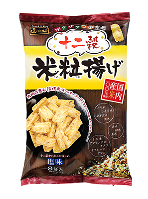 12種類の穀物の風味・特徴をいかした「ザクザクつぶ」食感が楽しめる、優しい塩味の米菓です。携帯にも便利な個包装。いつでも手軽に12種類の穀物の恵みが楽しめます。