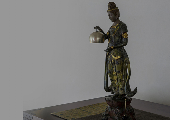 天平仏教美術の傑作を 高岡銅器の蝋型製法で、おりんと一体となったブロンズ像に仕上げました。一品一品手仕上げによる漆古色を施し、美しく響く音色と荘厳な空間を醸し出します。