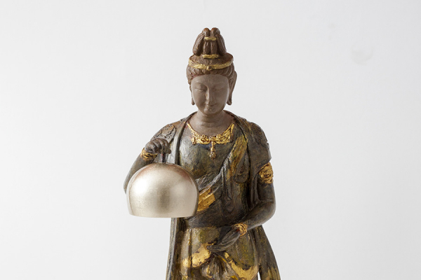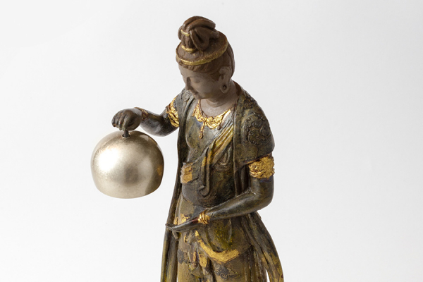 熟練技を駆使し、音声菩薩の豊かな表情や御身を彩る装飾、肩から垂れる条帛など細やかに表現。緩やかにたなびく天衣は天上の風を受けて、翻っているかのようです。これは銅に漆を塗り重ねた後、彩色を施す独自の手法で、古色を帯びた雰囲気や温かみを生み出しているからにほかなりません。