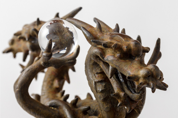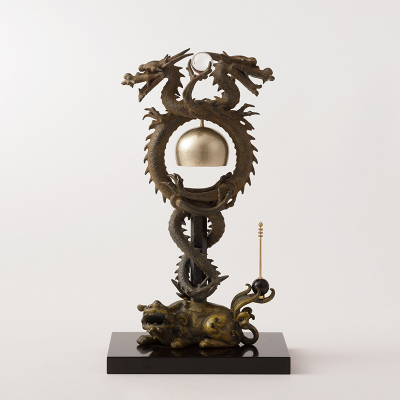本品は獅子の背に六角柱、その柱に二龍が巻き上がり円形の空間を作り出し、頭上に水晶玉、中央上におりんを配した姿になっています。蝋型師大森孝志によって、本来のイメージを損なうことなく加飾した本作は、一品一品手仕上げによる漆古色を施し、荘厳な空間を醸し出した傑作です。