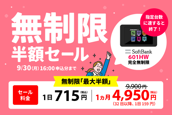 セール対象の商品は「SoftBank 601HW/603HW(無制限)」です。こちらの商品は通信容量が無制限のWi-Fiルーターによくある日次制限がなく、完全無制限でご利用いただけます。また、高速通信が可能なため、数多くのお客様に人気の商品となっております。1日単位でレンタル可能なため、シルバーウィークのご予定に合わせたご利用にも最適です。
