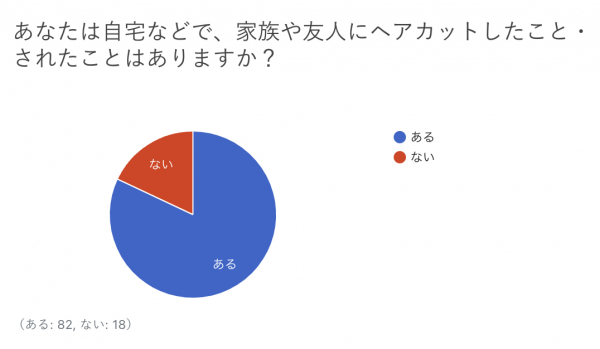 「家族や友人にヘアカットしたこと・されたことはありますか?」の回答は、“ある”が82%、“ない”が18%となり、多くの人が素人ヘアカットを経験しているという結果でした。