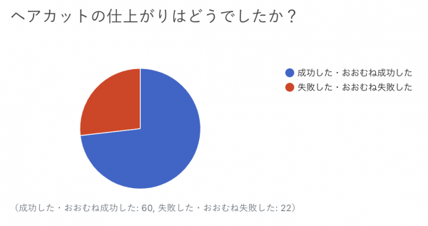 また、「ヘアカットの仕上がりはどうでしたか?」の回答は、“成功した・おおむね成功した”が73%、“失敗した・おおむね失敗した”が27%となり、おおむね成功したという人が多い結果でした。