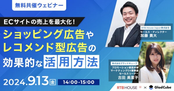 株式会社グラッドキューブ(本社:大阪市中央区 代表取締役 CEO 金島 弘樹 以下:グラッドキューブ)は、RTB House Japan 株式会社(本社:所在地 ポーランド・ワルシャワ、社長 ロバート・ディチコフスキー、日本支社:東京都品川区)と共催で、2024年9月13日(金)14:00よりオンラインセミナーを開催いたします。