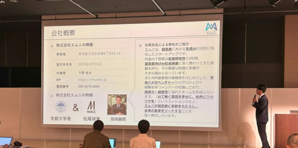 株式会社エムニからは代表取締役 下野様がご登壇いただき、製造業界×生成AIのトレンドについてお話しいただき、製造業の課題から、オーダーメイドAIによる業務へのAI活用、特許調査業務の効率化をご紹介いただきました。